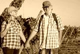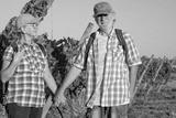 Senior smiling couple of tourists in Tenerife travel visiting vineyard walking amongst grapevines. People on holiday wine tasting experience in summer valley landscape.