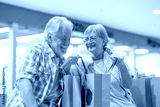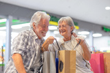 Smiling caucasian senior couple enjoying shopping, sitting looking with satisfaction at their purchases in the shopping bags, consumerism sales customer concept