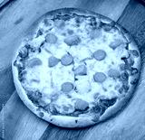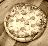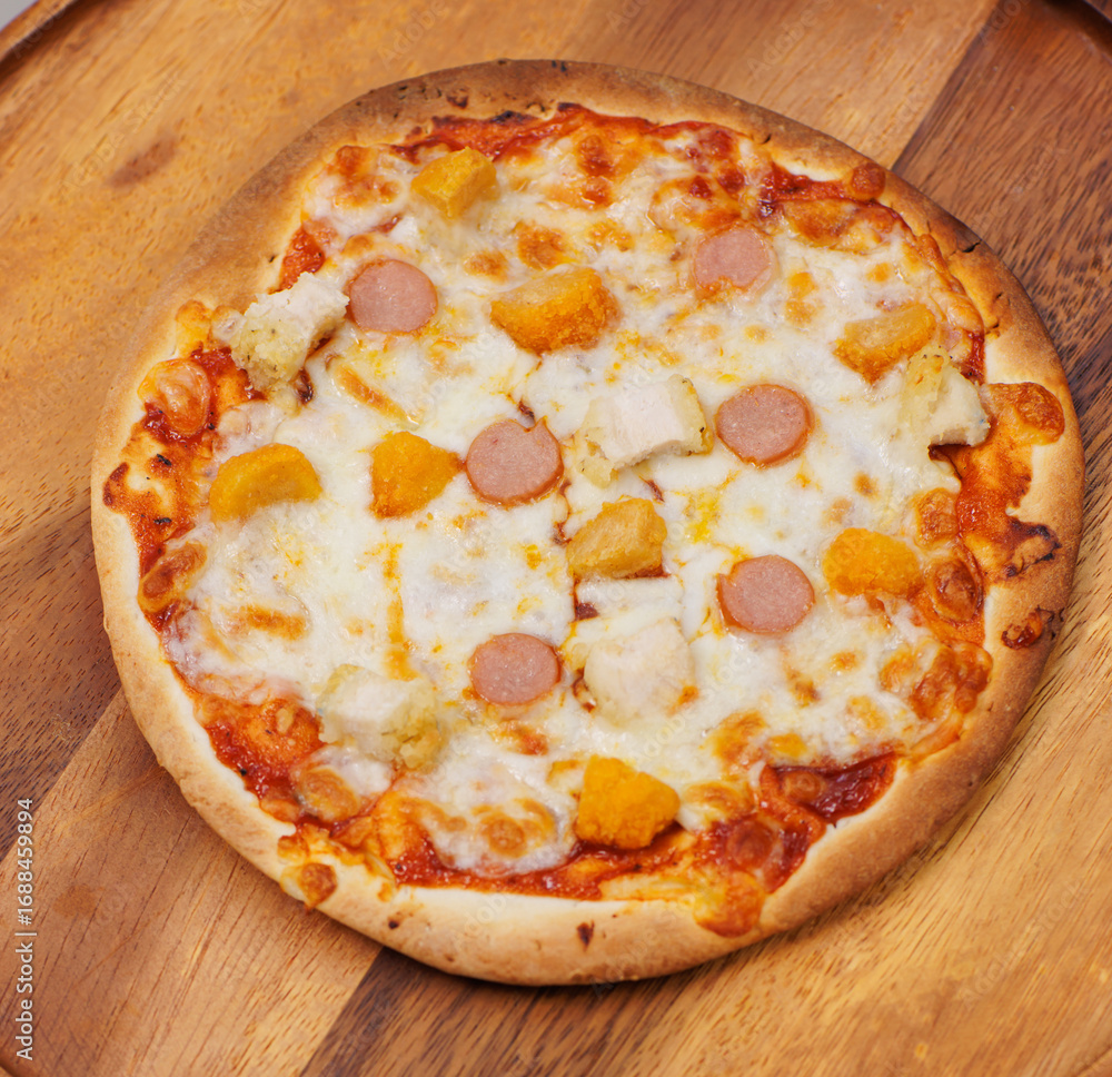 Tasty chicken and sausage crispy pizza flatbread baked on wooden plate, delicious melting mozzarella cheese on wooden board, homemade cooking ingredients lying on dark background, food advertisement.