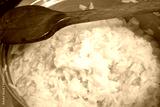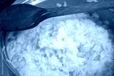 Hot cooked rice in a pot with a wooden spoon on the stove, close-up shot.