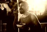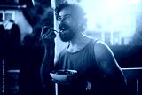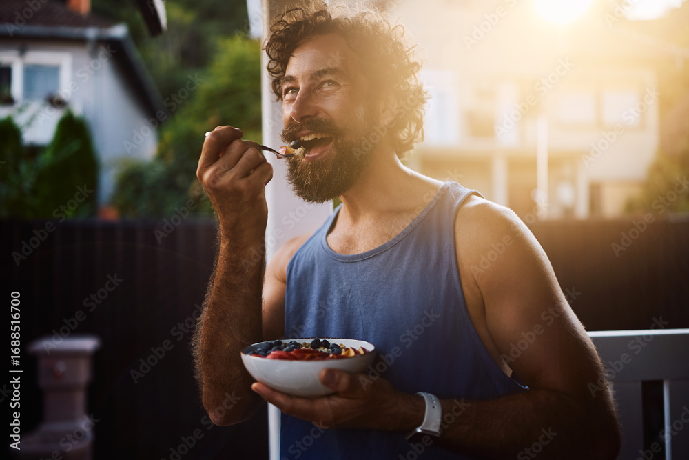 Happy sportsman having healthy fruit oatmeal after exercising.