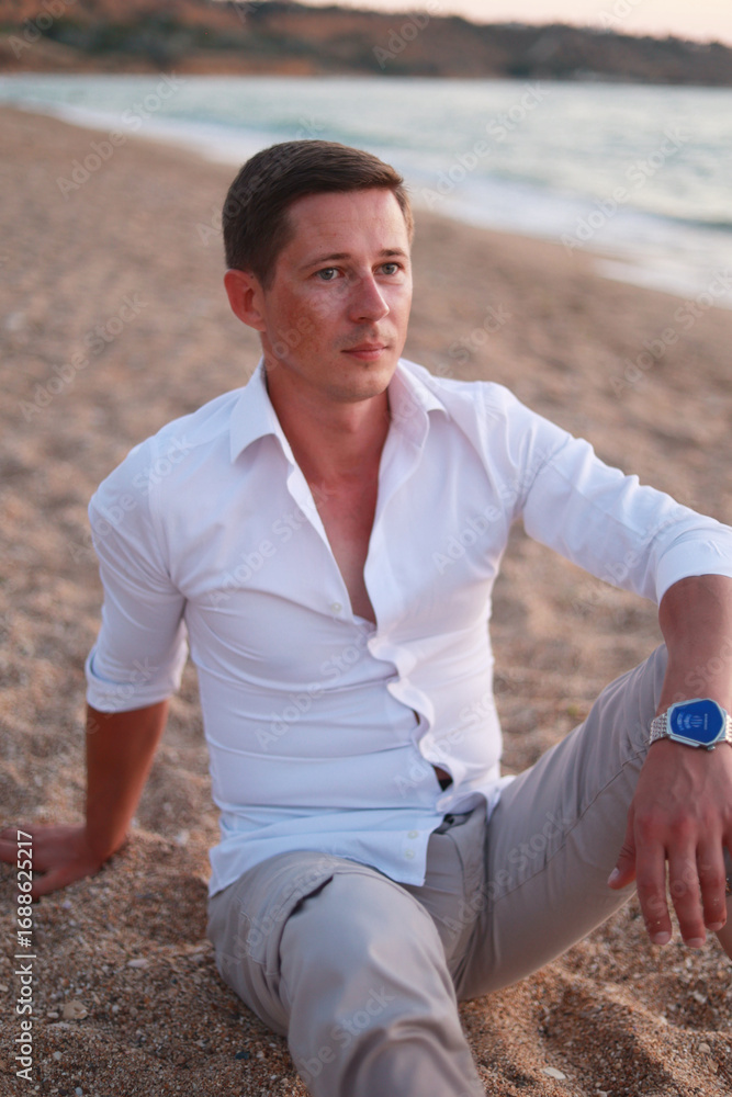 A man in a white shirt is relaxing on the beach, against the background of ocean waves. Tanned guy posing on vacation