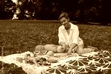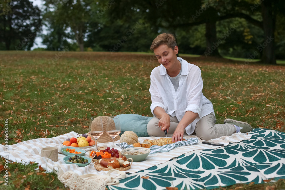 Woman Relaxing Outdoor Picnic Wine and Fresh Fruits