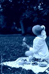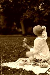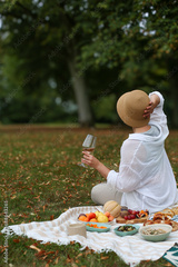 Woman Relaxing Outdoor Picnic Wine and Fresh Fruits