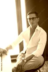 A young man is sitting at home using his phone in a cozy living room wearing a white shirt and glasses, with large windows in the background.