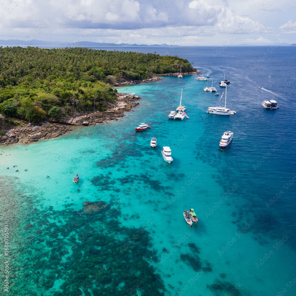 Aerial view of Koh Racha Yai Island with many tour boats, yacht, catamaran and longtail boat anchoring around the bay. A popular destination for summer vacation in Phuket, Thailand.