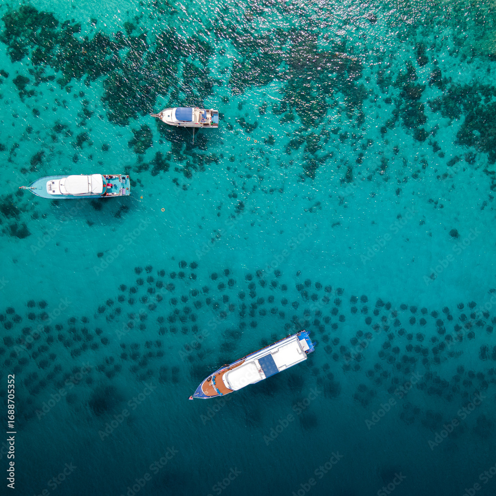 Aerial view of Racha Yai Island or Koh Raya with tourboat, yacht and diving boat anchoring over the artificial reef. A popular destination for summer vacation in Phuket, Thailand.