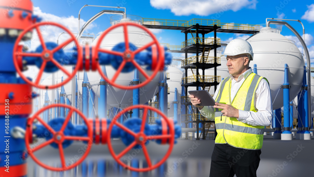 Operation control at oil and gas refinery, engineer with tablet in safety vest and helmet inspecting valves and storage tanks, energy, engineering, industry, technology.