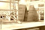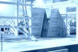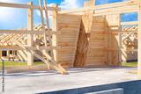 Construction of wooden house. Erection cottage made of logs. Construction of buildings from boards and plywood. Frame of wooden house on concrete foundation. Construction of wooden cottage village