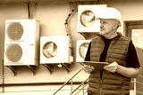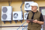 Air conditioning maintenance. Technician in hard hat with tablet inspects outdoor HVAC units on building wall, Heating, Ventilation, Air Conditioning service.
