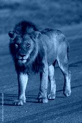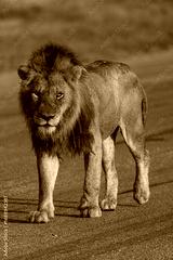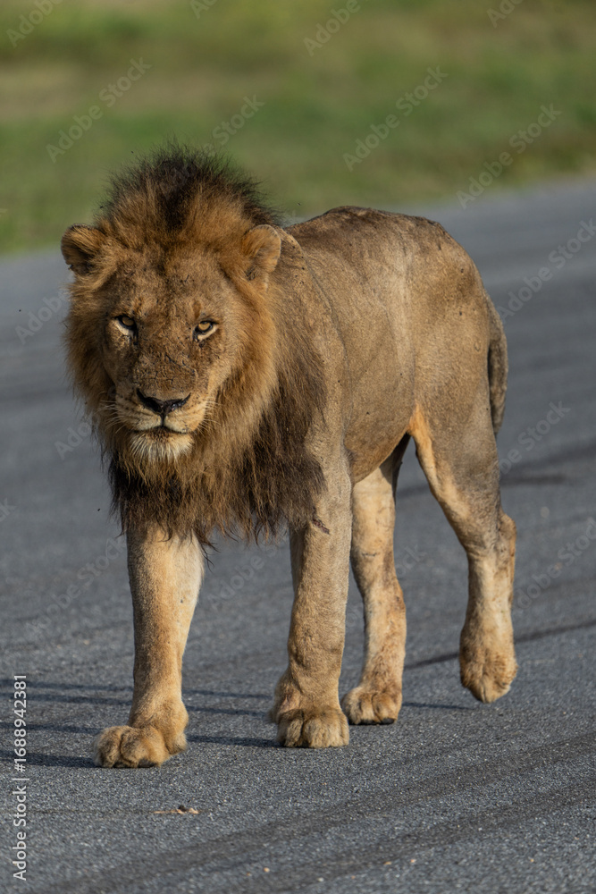 A male lion walking on a tarred airstrip in beautiful golden morning light Greater Kruger.