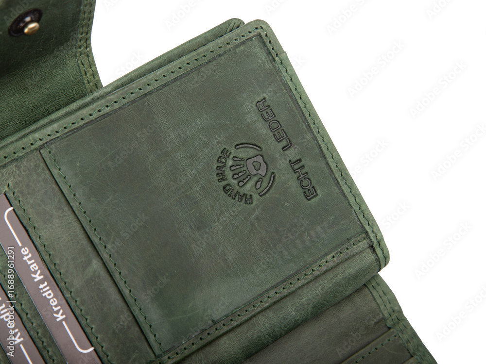 Handmade genuine leather wallet with RFID protection – green, closeup on detail sign.