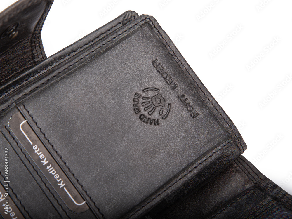 Handmade genuine leather wallet with RFID protection – black, closeup on detail sign.