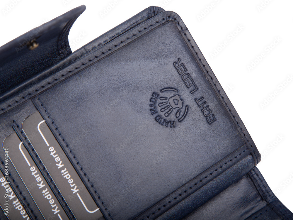 Handmade genuine leather wallet with RFID protection – navy blue, closeup on detail sign.