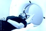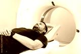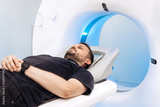 Male patient lying on examination table inside a modern computer tomography machine, preparing for a scan in a bright clinical environment, showcasing advanced medical technology and patient care