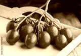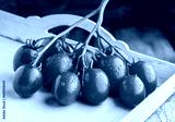 Tomatoes branch with drops of water in white old rustic box and wooden table in studio