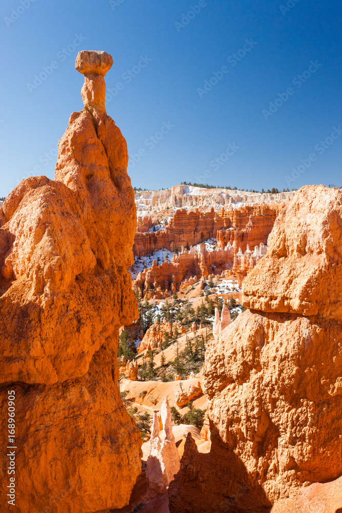 Deep red rocks form hoodoos and plateaus across the snow covered trees and ground
