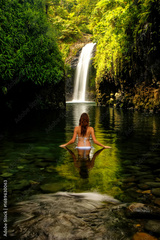 Young woman in bikini standing at Wainibau Waterfall on Taveuni Island, Fiji
