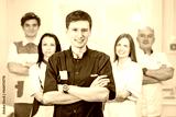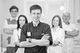 Group of dentists standing in their office and looking at camera.