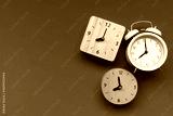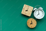 Retro alarm clock on green table background, vintage style, flat lay