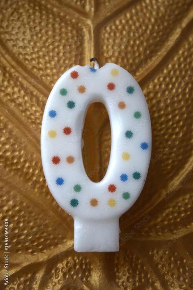 Close-up of a number 0 birthday candle on a decorative leaf-patterned plate. Concept of new beginnings, rebirth, and fresh starts.