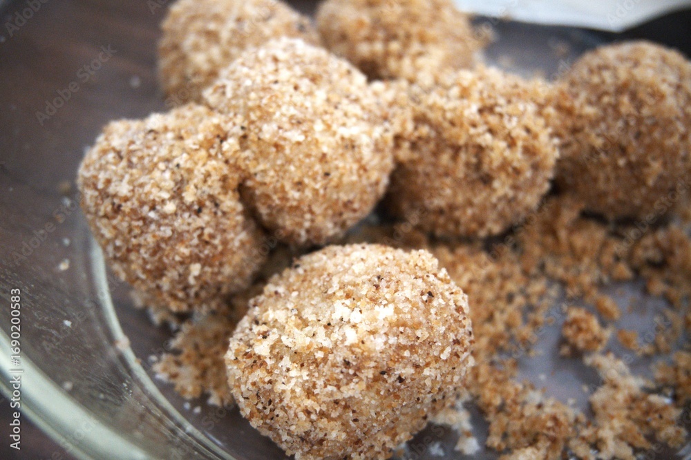 Traditional Hungarian plum dumplings (szilvás gombóc) served in a clear glass bowl. Authentic homemade dessert.