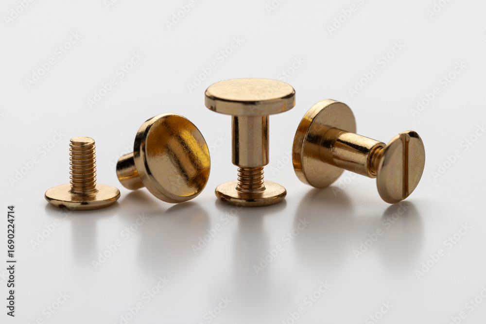Rivets and screws for leather goods made of yellow metal. White background, isolated, light and shadow.