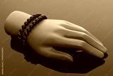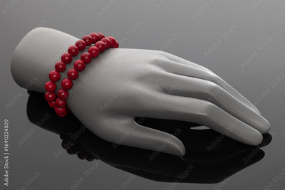 A necklace of red natural coral beads, on the wrist of a mannequin. Dark, mirrored background, reflection.