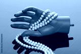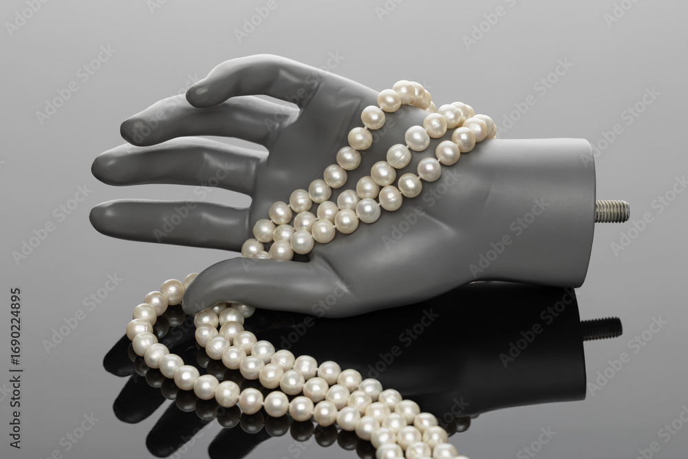 A necklace in three strands, made of natural pearls, on the wrist of a mannequin. Dark, mirrored background,