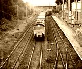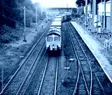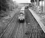Freight train moves through the Trafford station.
