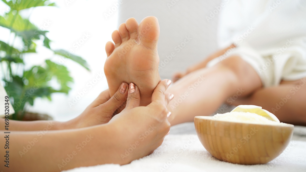 Close up foots spa. Spa body treatment for beauty and aroma therapy product for female feet and hand spa relax and healthy care, Masseur doing massage with treatment sugar scrub. Thailand