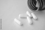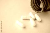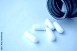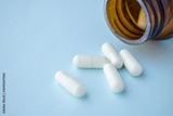 medicine pills capsule spilling out of bottle on blue background