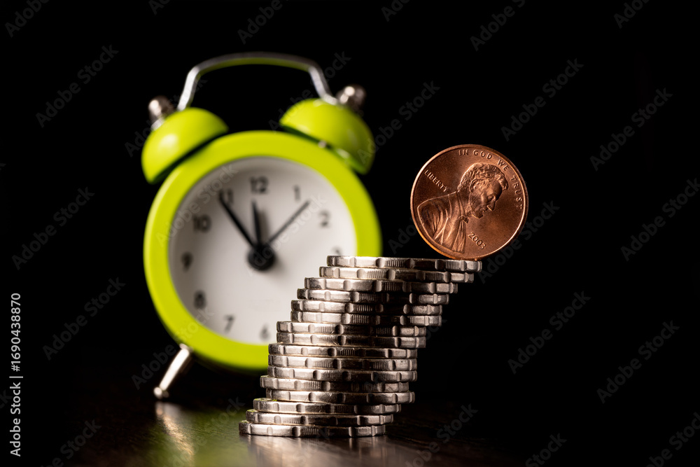 A US 1 cent coin on the edge of a slanted stack of coins