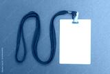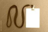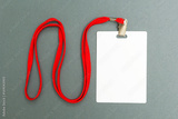 Blank badge mockup isolated on grey. Plain empty name tag mock up with string, on grey background.