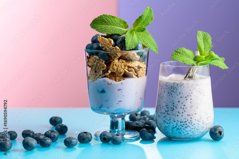 Blueberry dessert with rye flakes and smoothie with chia seeds.