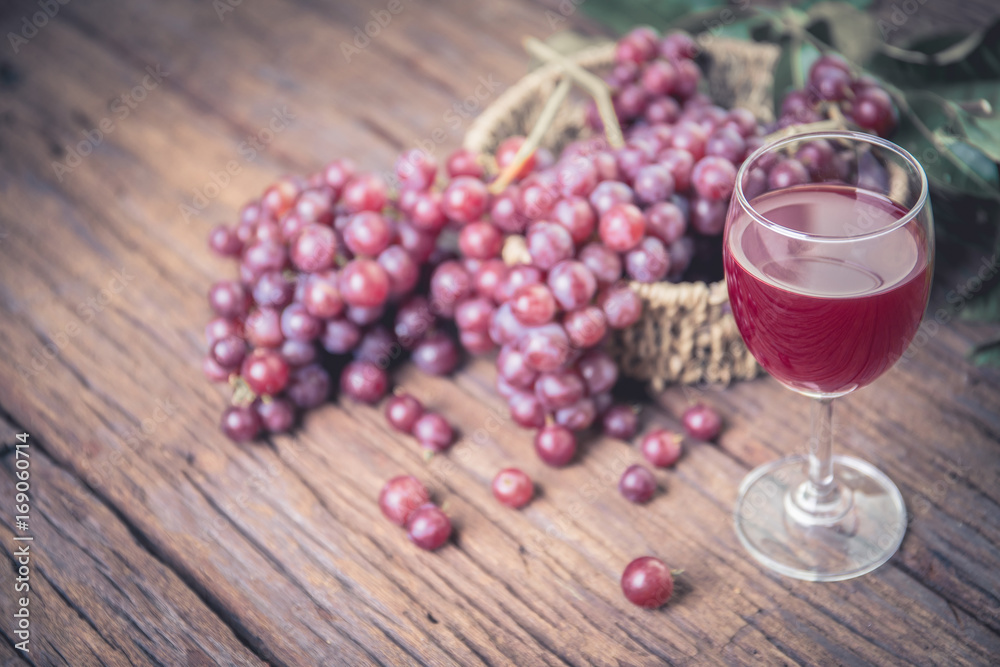 Glass of wine or grape juice and fruit on wooden table