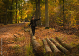 Cheerful woman with autumn leaf in the sunny forest