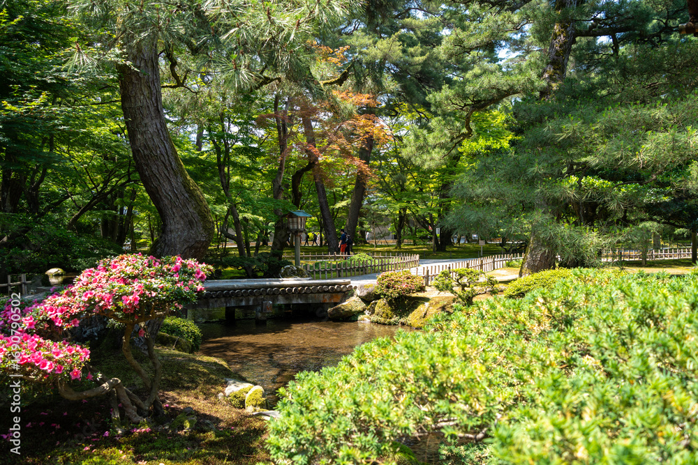 Peaceful stream and pine trees in Kenroku-en, Kanazawa, Japan