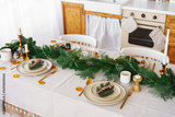 Christmas decor. Beautifully arranged dining table, elegant white plates, golden cutlery and spruce garland on white tablecloth, creating festive holiday atmosphere for meal with family and friends.