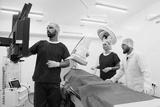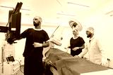 Medical team in blue scrubs collaborating in a modern operating room, preparing for an angiograph procedure with advanced imaging equipment and sterile environment for patient care