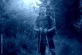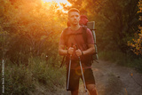 Handsome man hiker with backpack and poles walking through forest with warm sunset.