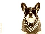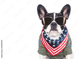 Cute puppy, American Flag, sunglasses and military t-shirt. Closeup, indoors. Studio shot. Congratulations for family, loved ones, relatives, friends and colleagues. Pet care concept