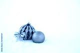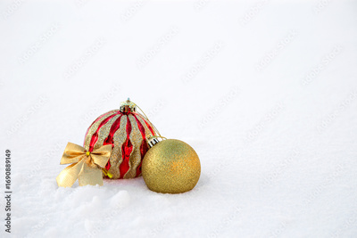 Christmas decorations and fir branches in fluffy snow. Copy space