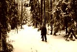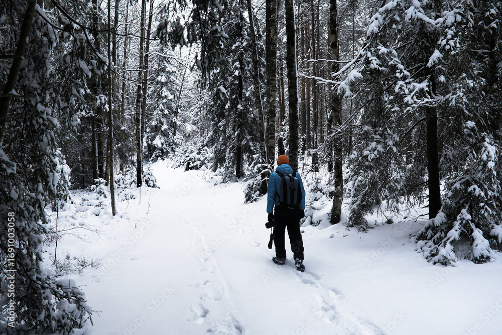 A man with a backpack travels in winter. A man in a snowy field. Hiking winter landscape.