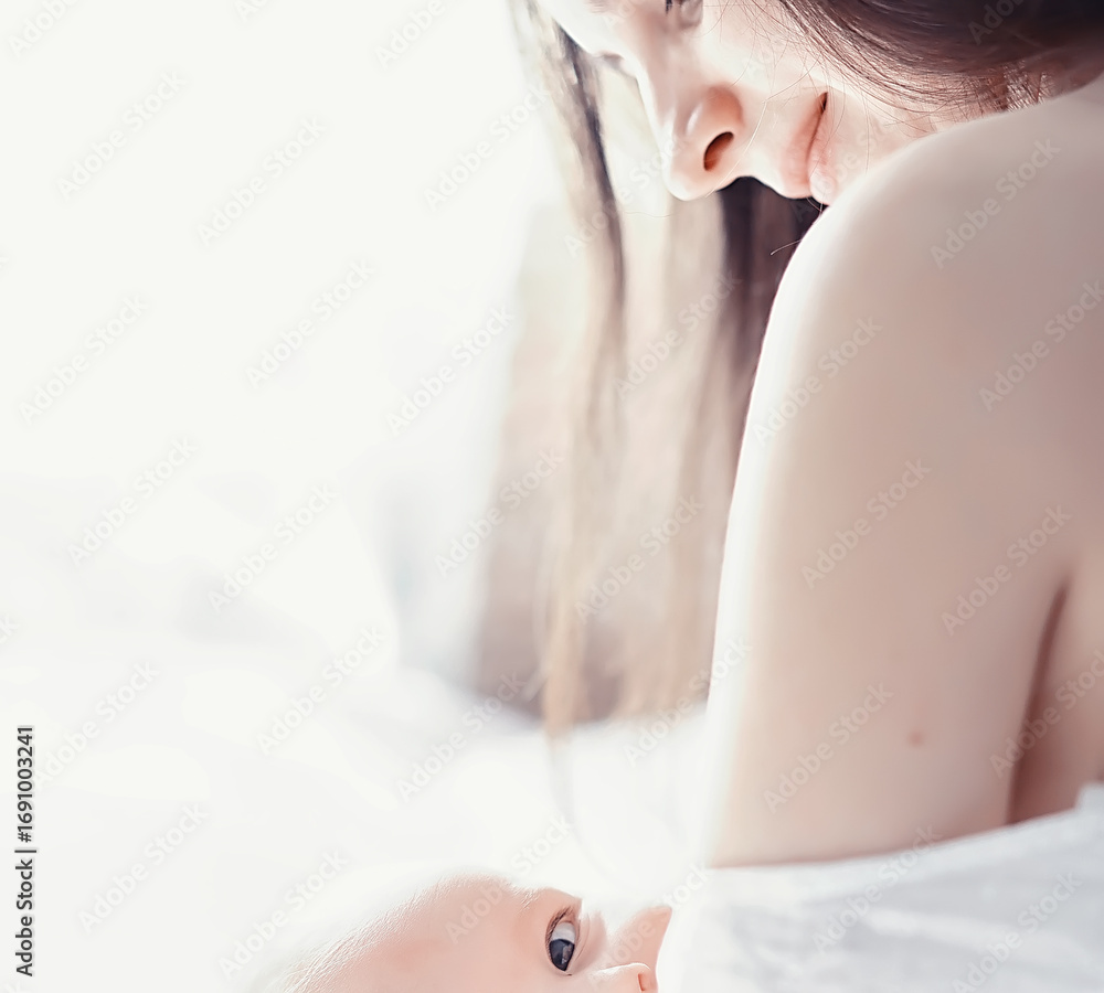 Maternity concept. A young mother feeds her little baby. First lure and breastfeeding. Family in white clothes.