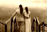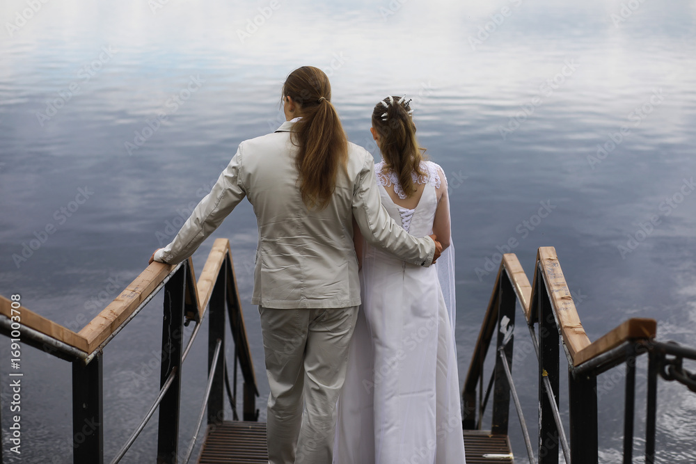 Bride and Groom Embracing on Wooden Pier Overlooking Serene Lake on Their Wedding Day