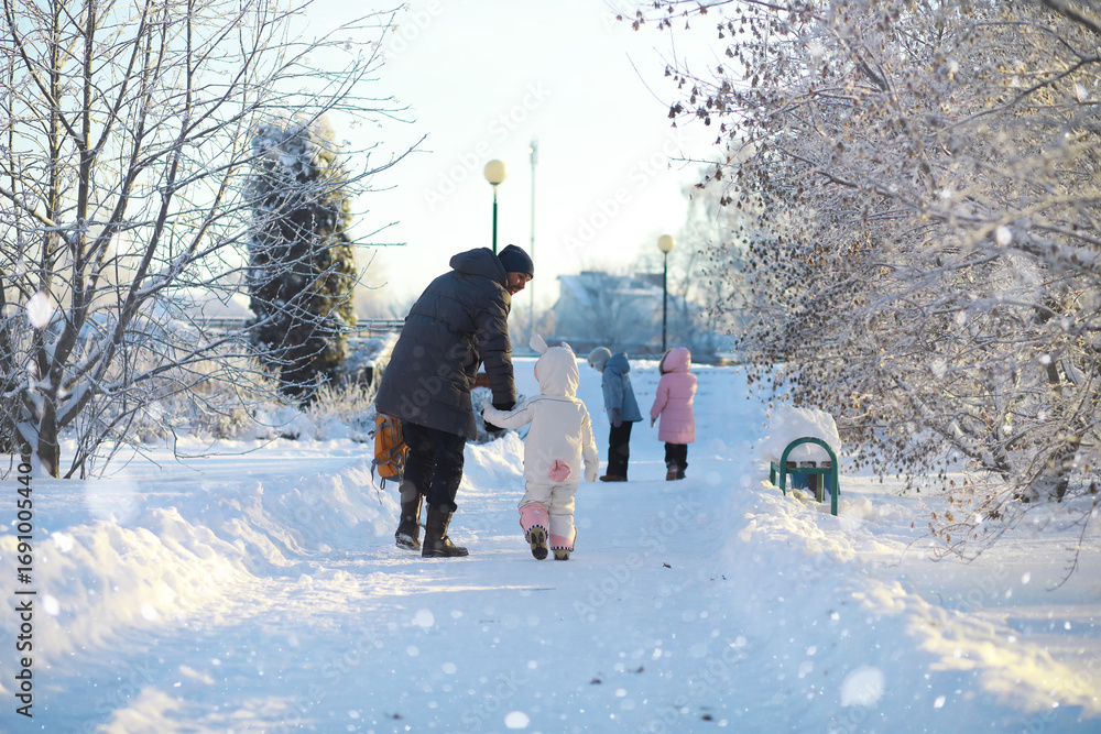 Winter walk on the street on a sunny frosty day. Family with children play snowballs in the park. Winter holidays and family vacation.