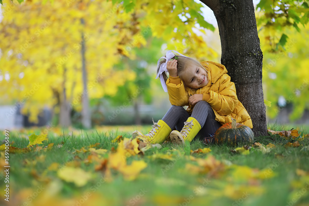Happy Child Sitting Under Tree in Autumn Park with Yellow Leaves and Pumpkins