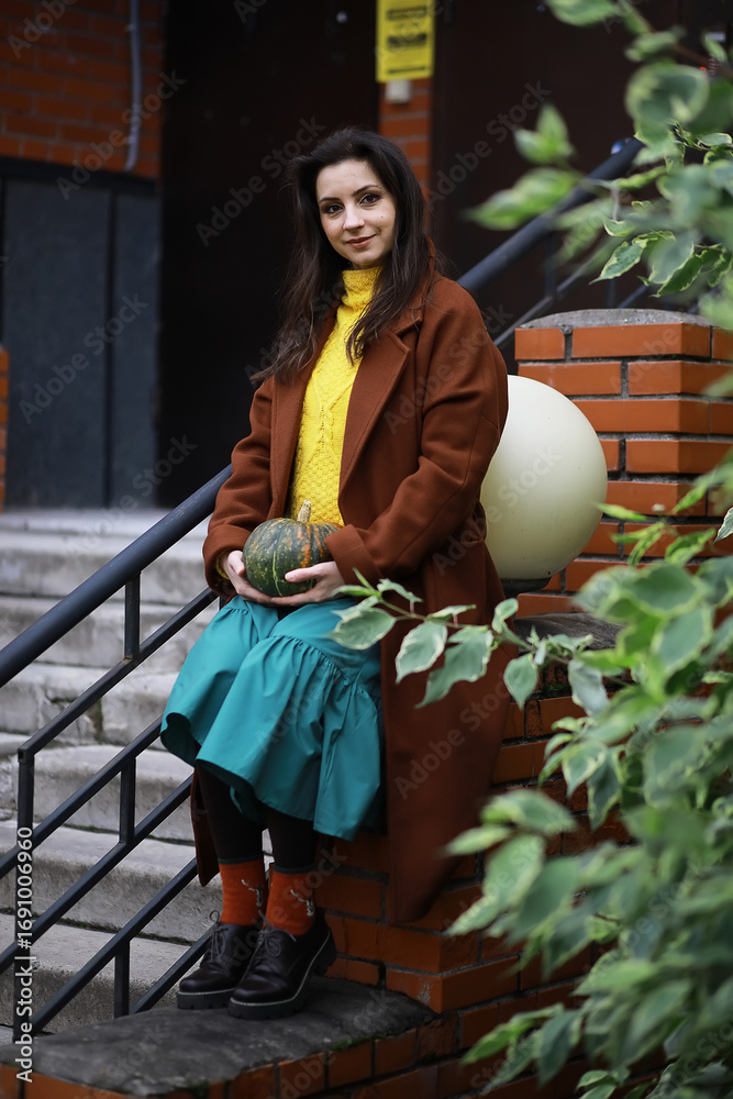 Autumn Fashion Portrait of a Woman Holding a Pumpkin on Urban Stairs