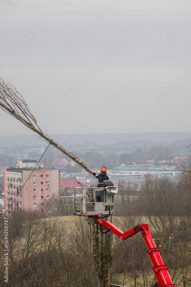 Pruning tree branches on a hoist with a petrol chainsaw.